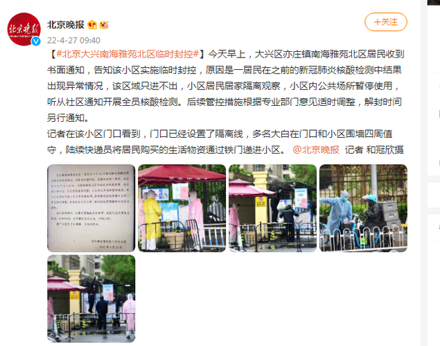在2022年5月14日11时那一时段起始之时开始,大兴区旧宫镇的德贤公馆鉴于疫情防控方面所需之缘故而实施封控管控举措,德贤公馆当中的6号楼被划定为封控区域,去施行“区域封闭、足不出户、服务上门”这样的措施,社区的工作人员以及志愿者着手为6号楼超过130户的居民供应生活物资配送以及垃圾清运之服务。