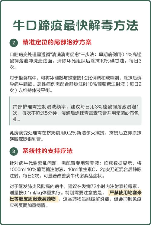 迄今口蹄疫不存在特效药物,医治的关键在于防范继发感染,针对患病牛的蹄部存在的溃烂之处,首先运用0.1%的高锰酸钾溶液予以清洗,接着涂抹碘甘油或者抗生素软膏,每日进行两次处理,以此降低细菌感染产生的风险。